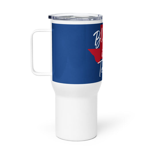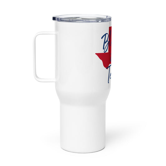 Blessed in Texas Red on Blue (White Print) Travel Mug w/ Handle 25oz
